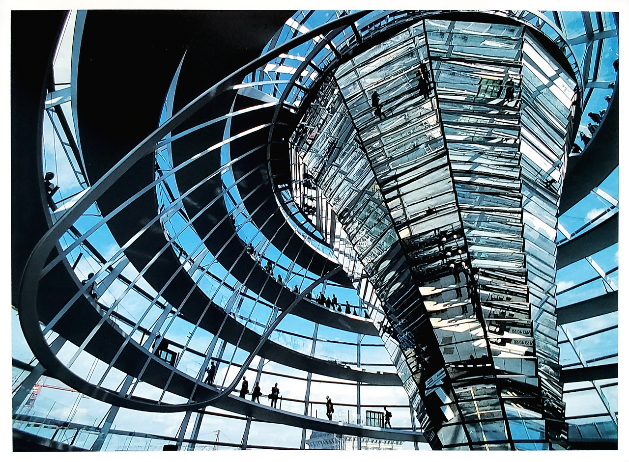 유리돔 안쪽에는 나선형 경사로를 설치하여 시민들이 여기서 베를린의 360도 전경을 볼 수 있고 회의장을 내려다보는 것도 가능하다고 한다. 유리돔은 투명하고 공정한 민주주의를 반영하고, 방문객이 오가는 돔이 회의장 위에 위치해 있는 것은 국민이 정부보다 위에 있다는 것을 상징한다고 한다.