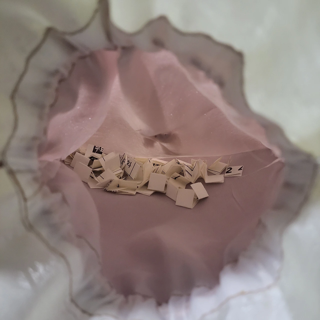 하지만 이번엔 뭔가 달랐으면 했다. 나는 바로 이면지 한 장을 가져와 작게 자르기 시작했다. 맞다. 바로 제비 뽑기다. 요즘은 미니 로또기계 장난감이 많아서 그걸로 뽑힌 번호를 적어간다고들 하는데, 나는 아날로그 감성이 좋다. 종이를 직접 찢고 손수 1부터 45까지 숫자를 적었다. 다시 그것을 두 번씩 접고 복주머니에 넣었다.