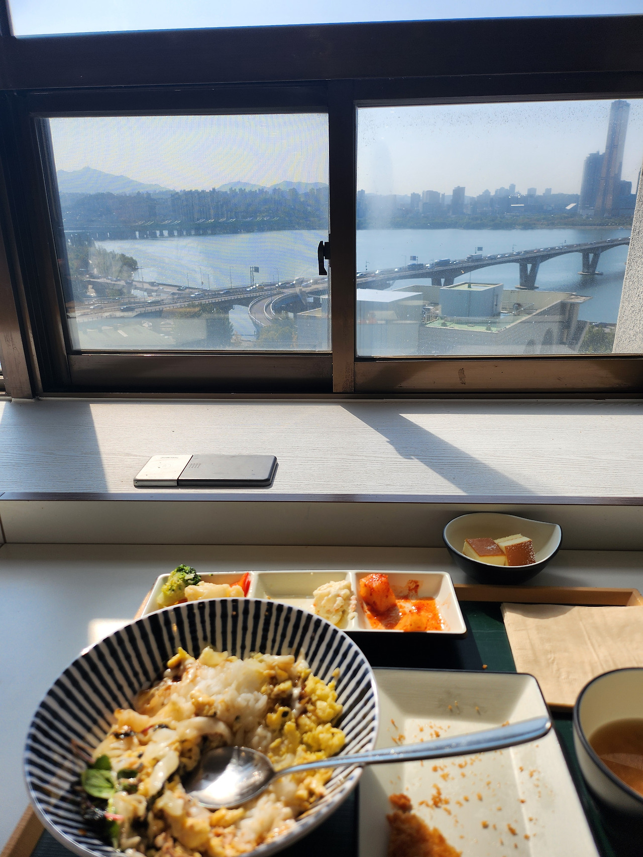 그런데 여기 사무실 식당은 건물 맨 꼭대기 층이어서 밖이 환히 보이는 곳이었고, 특히 혼밥을 할 수 있는 자리는 한강과 건너편에 63 빌딩이 보이는 곳이었습니다.