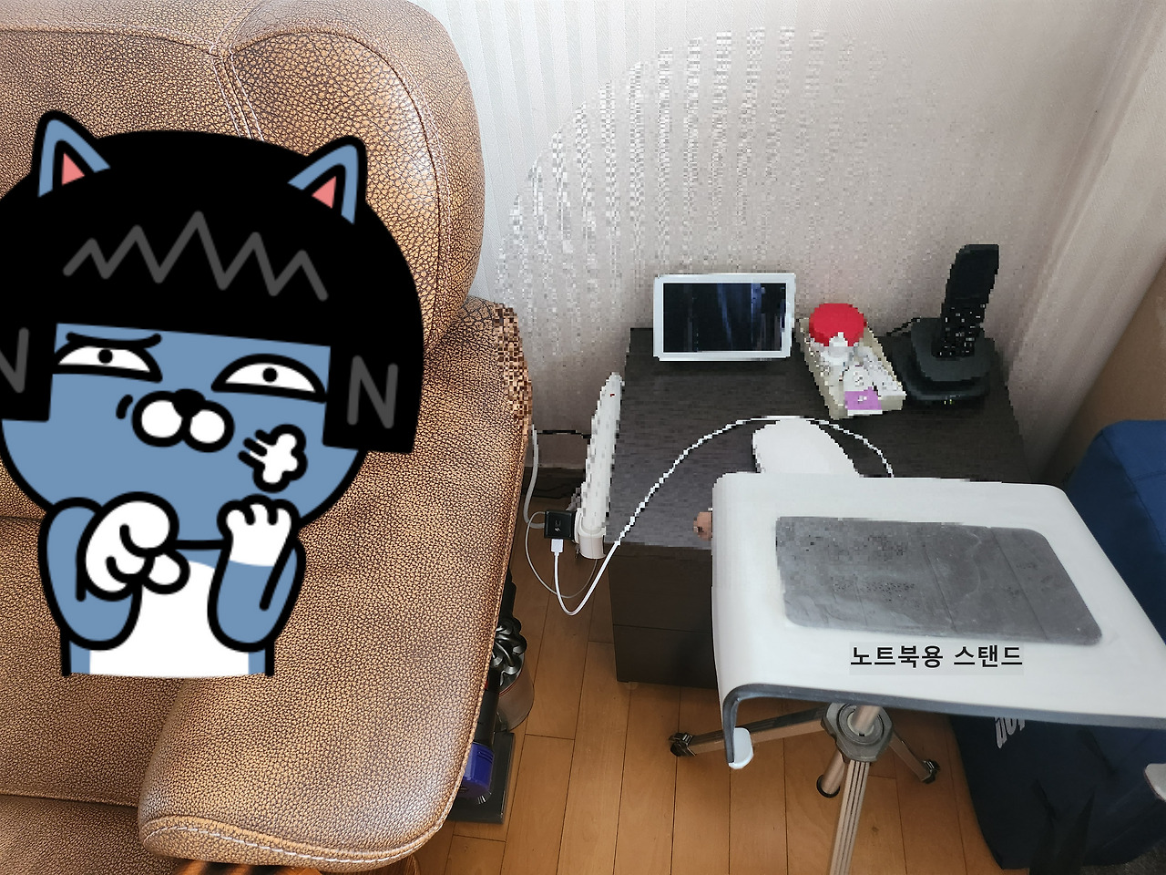 그도 그럴 것이 소파 한쪽에 조그만 협탁과 노트북용 스탠드가 나름 저만의 공간이기 때문이지요.