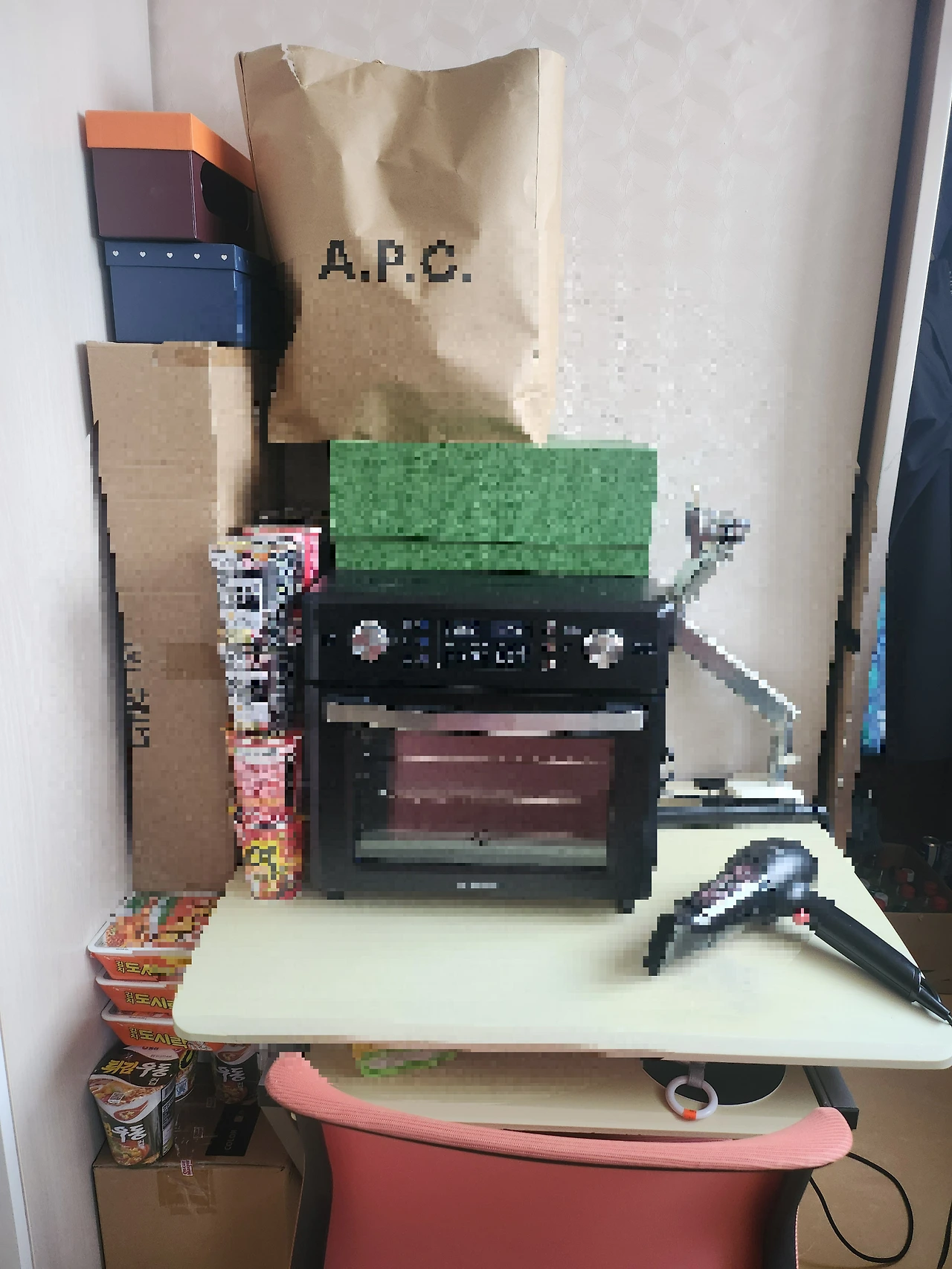 에어프라이어, 종이상자 여러 개, 다수의 컵라면들 그리고 헤어드라이기 등이 한가득 쌓여있어 정리가 필요합니다. 문제는 저 물건들을 어디에 넣어야 할지가 또 고민이 됩니다.
