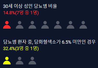 우리나라 30세 이상 성인 7명 중 1명이 당뇨병을 앓고 있으며, 성인 약 1,500만 명이 저와 같은 당뇨병 전단계 상태라고 합니다.