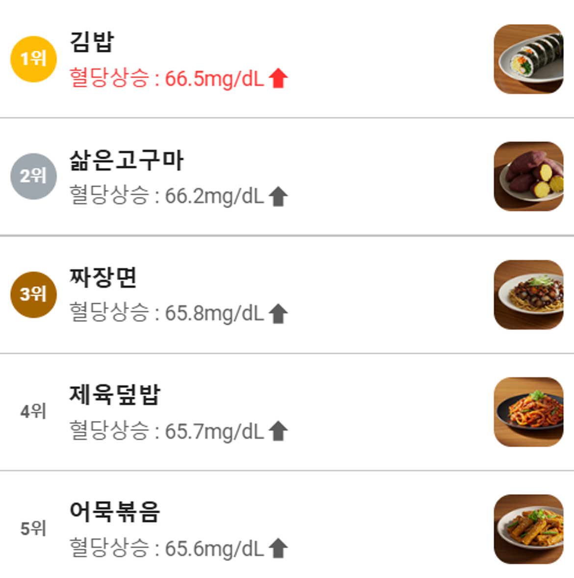 역시 식후에 혈당을 가장 높인 음식으로 김밥이 1위를 차지했네요. 평균 혈당도 66.5mg/dL 만큼 높이는 것으로 나왔는데, 저는 100mg/dL 이상 오르는 것을 확인했습니다.