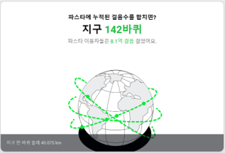 파스타 앱을 이용한 사용자들이 1년 간 운동으로 7,438만㎉를 태웠다고 하네요. 누적된 걸음수를 합치면 무려 지구 142바퀴(지구 한 바퀴 둘레가 40,075㎞)이고, 8.1억 걸음을 걸었다고 합니다. 저만해도 예전에는 차를 타고 인근 마트와 시장을 다녔는데 지금은 걸어서 다닙니다. 처음에는 멀다고 느껴졌는데 자주 걷다 보니 한 20~30분 거리는 가깝게 느껴지네요.