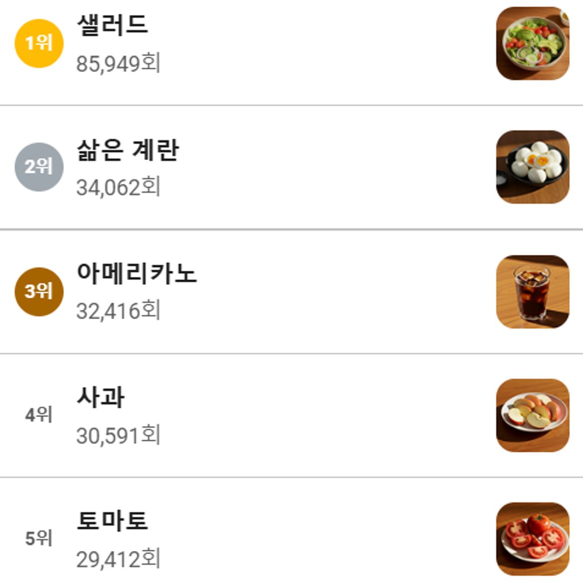가장 많이 기록한 음식은 역시 '한국인은 밥심'이라는 말과 같이 현미밥, 그리고 김치 순서로 되어 있네요. 그리고 간식으로 많이 먹었던 사과와 계란도 보입니다.