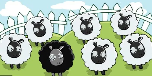 풀밭의 흰 양 떼들 속에 검은색 양(Black sheep)은 정말 눈에 잘 띄는데 이렇게 눈에 띄는 것이 좋은 의미보다는 부정적인 의미와 연결되어서, 무리와 잘 어울리지도 못하고 골칫덩어리 혹은 말썽꾸러기의 의미로도 쓰인다고 합니다(Ellie의 100% Real USA Life 블로그에서 발췌).