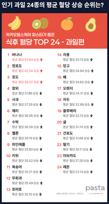 오늘은 파스타에서 보내준 '식후 혈당 Top 24 -과일 편'에 대해 공유드렸으니, 참고하시어 혈당 관리하시길 바랍니다.