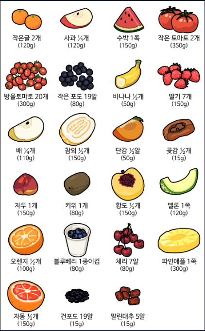 사실 과일을 먹을 때 '1 교환 단위'를 기억하고 먹기가 쉽지는 않습니다. 그러니 본인이 좋아하고 즐겨드시는 과일이 있다면, 그 기준을 기억해 두시면 드실 때 조절이 가능할 것이라 보이네요.