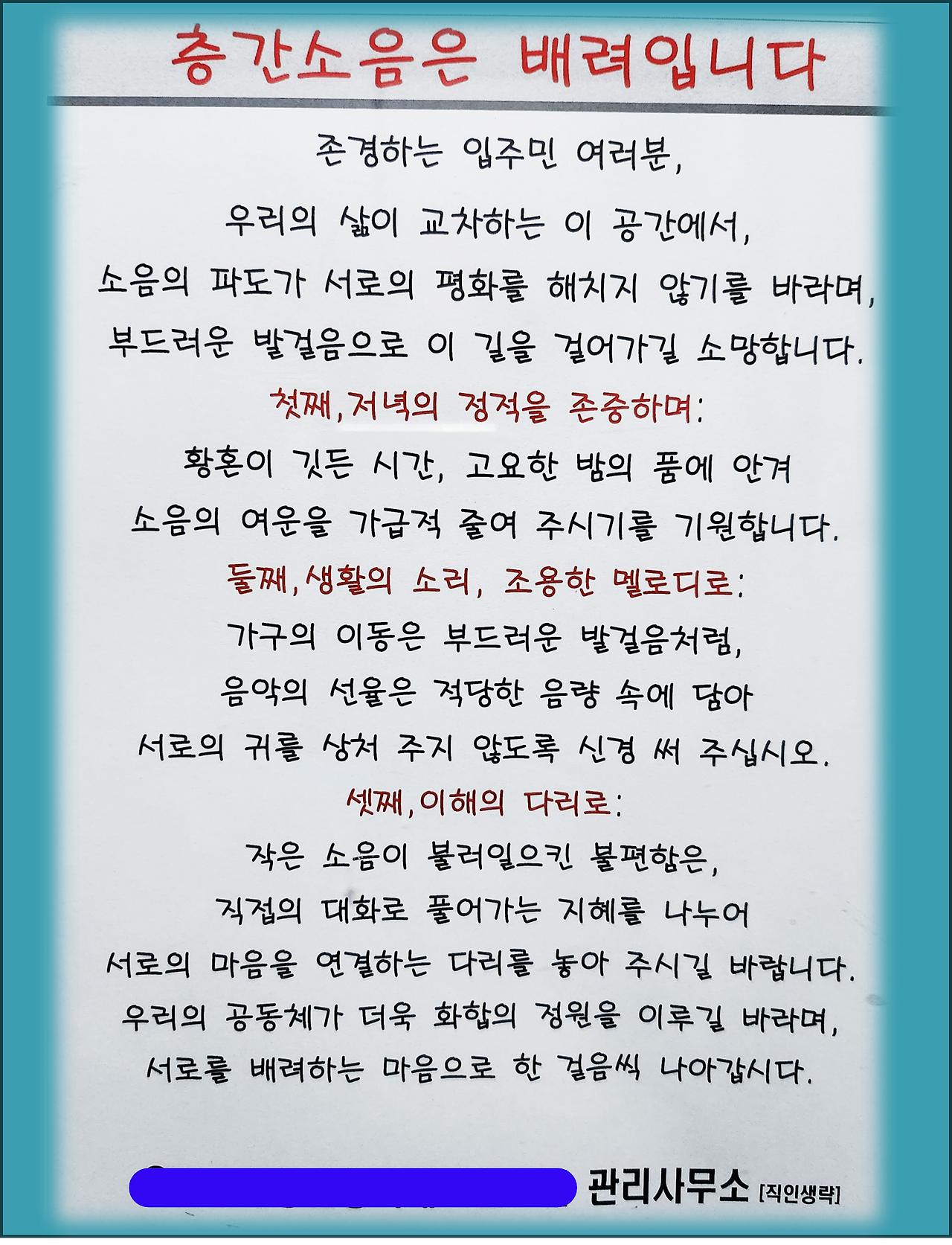 특히 "작은 소음이 불러일으킨 불편함은, 직접의 대화로 풀어가는 지혜를 나누어~~"이라는 문장에서 관리사무소 직원의 간절한 바람이 느껴졌습니다.