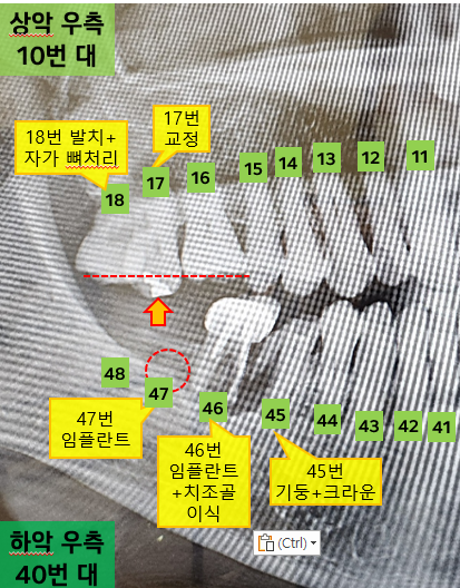 향후 47번에 임플란트를 할 경우 위아래 치아의 교합에 문제가 생기기 때문에 17번을 위쪽으로 밀어 올리는 교정이 필요하다고 합니다.