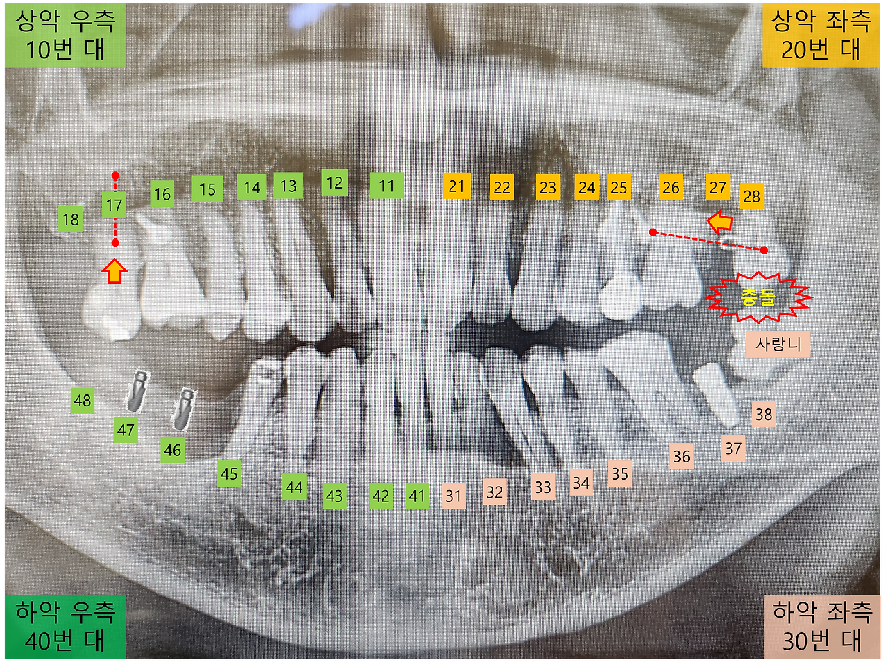 지난번 교정 장치 조정 후 일주일이 지나면서, 28번 치아가 다시 사랑니와 부딪치는 증상이 재발되었네요.