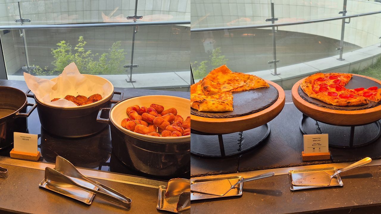 고르곤졸라와 페퍼로니 피자, 크로켓, 미니 핫도그가 있는데 맛은 그냥 아는 맛 정도입니다. 배가 부를 것 같아서 조금씩 맛만 보고 눈으로만 먹었습니다.