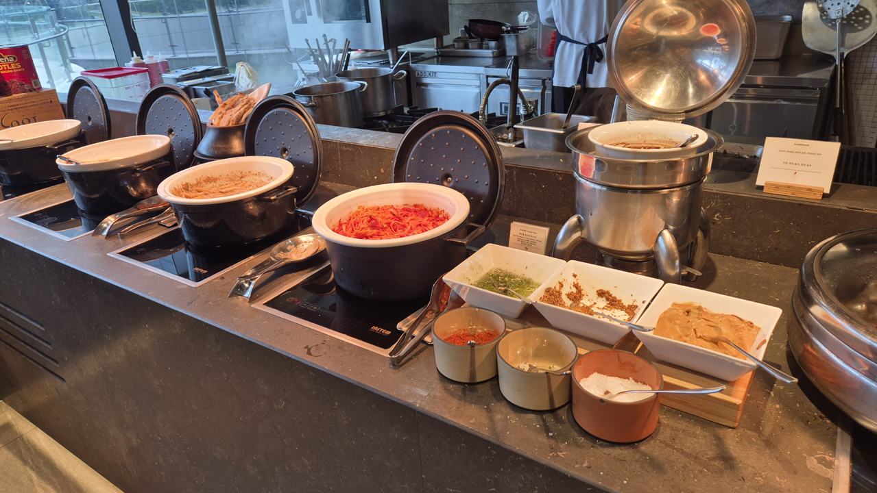 그래도 다른 곳에서는 볼 수 없었던 음식이 있었는데, 바로 '히야시츄카'라는 일본식 냉라멘으로 직접 고명을 넣어서 만들어 먹는 코너입니다. 고명을 올리고 육수를 반국자 정도만 부어주고 비벼서 드시면 되는데 개운한 느낌은 드네요.