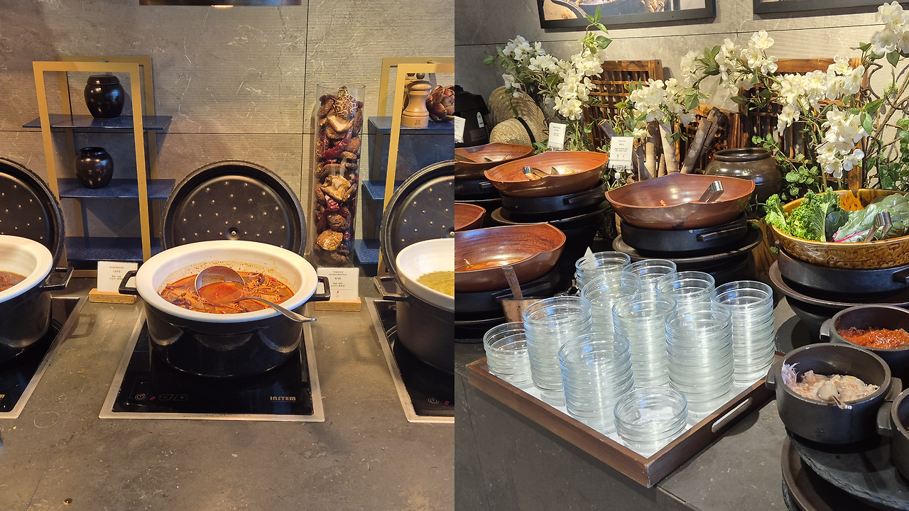 샐러드 코너 옆에 자리 잡은 한식 코너로 소갈비찜, 해물탕, 잡채와 죽 등이 있으며 쌈도 준비되어 있습니다.
