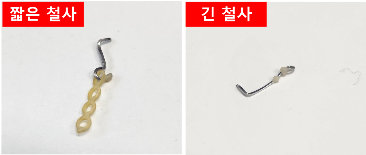 왼쪽 28번 치아는 벌어진 치아 간의 간격을 더 줄이기 위해, 기존 보다 길이가 긴 철사를 이용하여 당긴다고 합니다. 그런데 긴 철사를 사용하면 움직임이 커지기 때문에 장치가 쉽게 떨어질 우려가 있다고 합니다.
