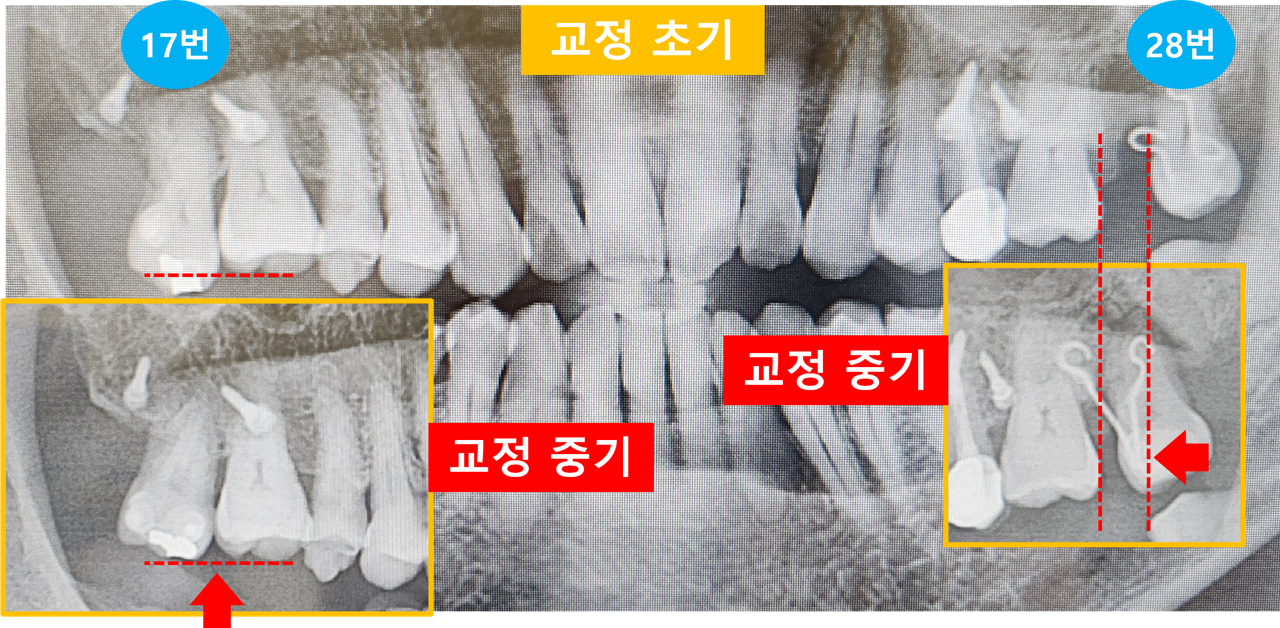 오른쪽 28번 치아는 빠진 27번 치아의 틈새를 거의 메꾸고 있는 것이 보입니다.