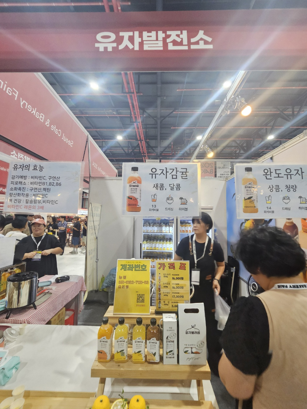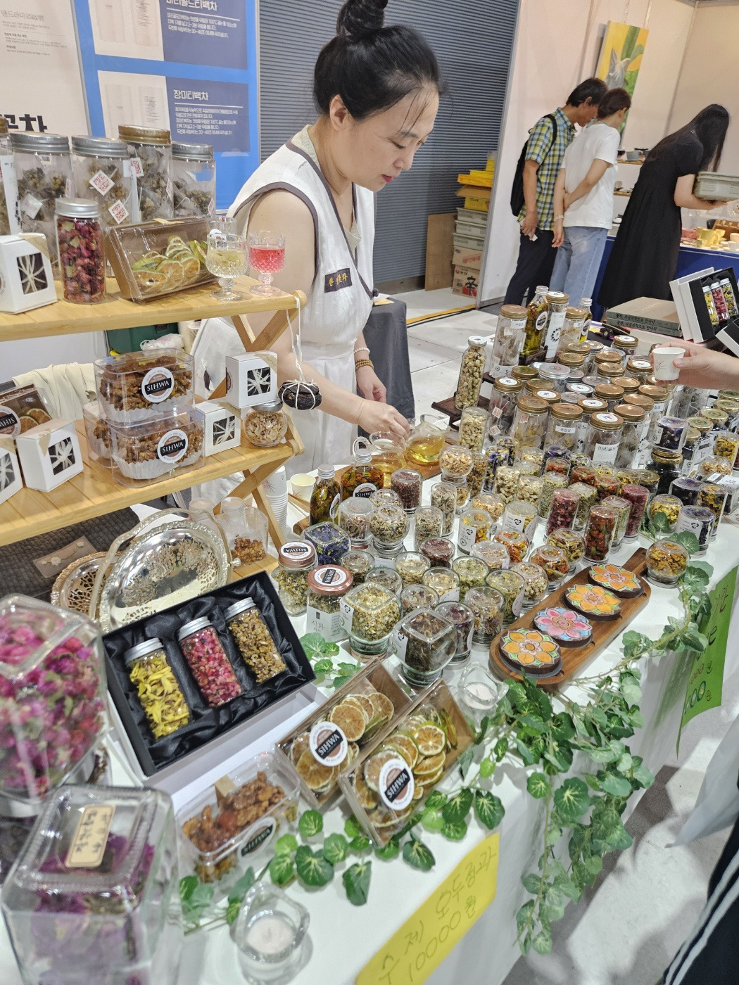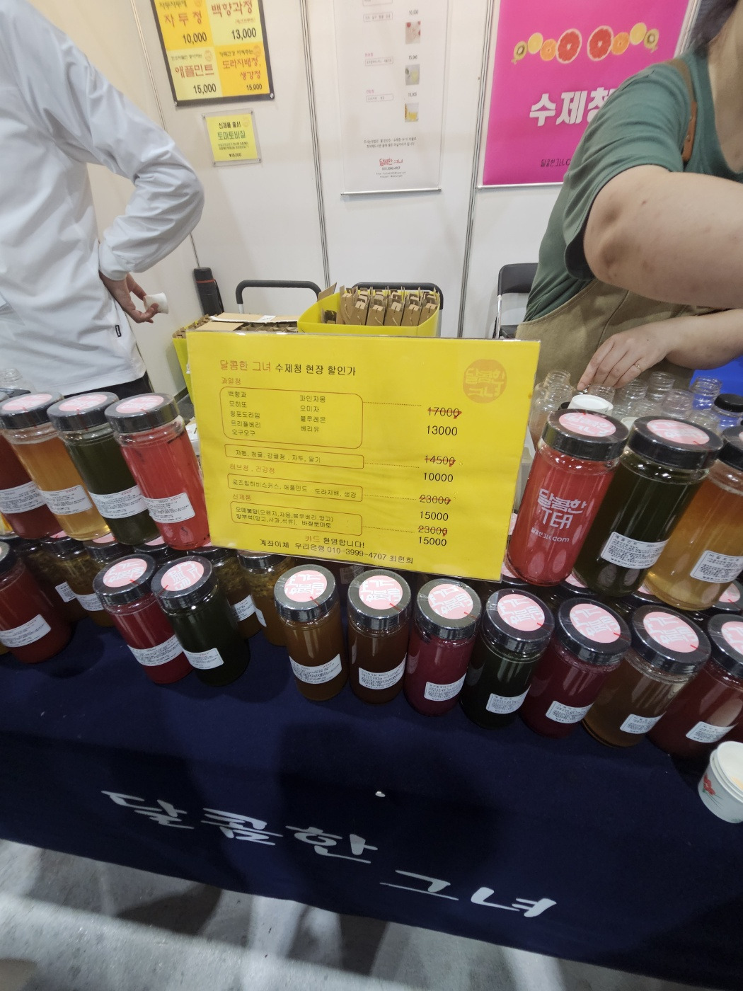 일단 입장해서 눈치를 보니 다들 시음을 하거나 아이스크림을 먹고 있었다. 그래서 일단 나도 시음하러 다녔다. 첫 부스는 굉장히 다양한 수제청을 하나하나 다 시음잔에 따라주시면서 설명까지 자세하게 해 주신 친절한 분이 계셨던 '달콤한 그녀'라는 곳이었다. 단 걸 좋아하는 내 입맛에는 너무 잘 맞았고 독특한 청도 꽤 있었는데 전부 맛있었다. 먹자마자 사고 싶었지만 아무래도 지갑사정과 쇼핑모멘텀에 대한 우려로 참았다. 집에 돌아와서 맛있었던 업체들 검색해 보다가는 살 걸 그랬다고 후회를 하긴 했다. 박람회라고 싸게 팔긴 하셨더라.