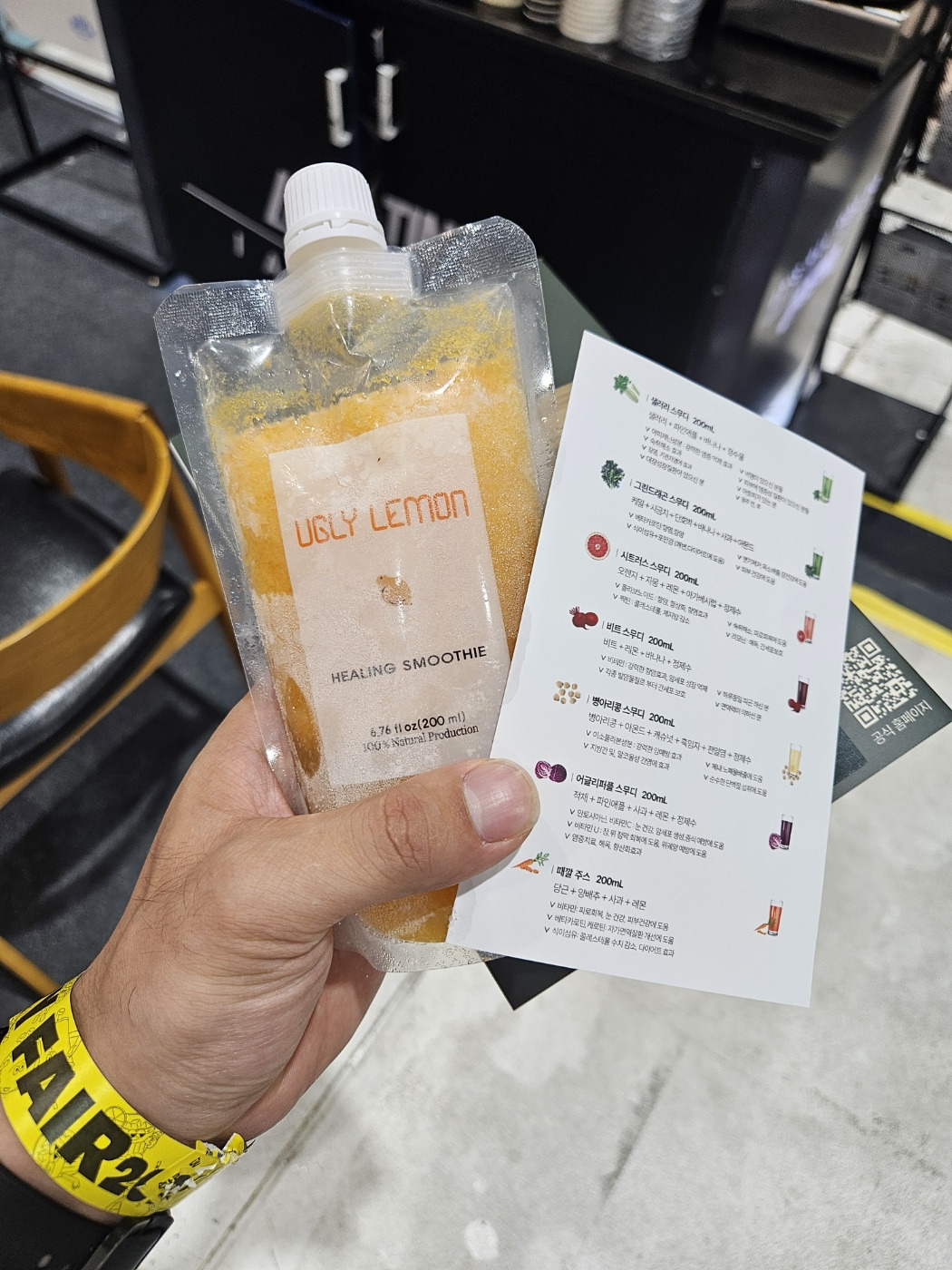 '어글리레몬'이라는 부스에서는 인스타 이벤트를 하길래 참여하고 시트러스 스무디를 받았다. 처음에는 이런 일들이 해보고 싶어도 할 줄 몰라서 못 했고, 그런 일들이 반복되는 것에 지쳐서 처음 용기를 냈었다. (누군가에게는 정말 하찮은) 첫 도전을 성공해 봤을 때부터는 같은 일에 아무런 감정적 어려움도 느끼지 않게 되었다. 그냥 이미 너덜너덜해진 개인정보 데이터를 제공하는 대가로 공짜로 뭘 얻어서 이득 본 감정만 드는 것이다. 이것도 크게 보면 바람직한 일은 아니긴 하다.