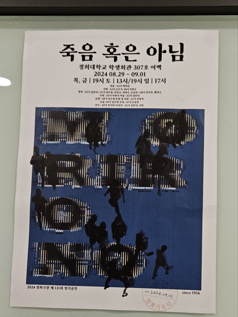 며칠 전 학교 학생회관에서 경희극장이라는 교내 연극동아리가 1956년부터 이어져온 정기공연을 한다는 포스터를 봤다. 기숙사 엘리베이터 앞 게시판이었다. "죽음 혹은 아님"이라는 극 제목의 ㅁ과ㅁ의 각운도 좋았고, '무슨 이야기를 할까?' 제목 자체의 의미도 궁금해서 관심이 갔다. 프로가 아닌 아마추어 대학생들이 하는 연극은 어떨지도 궁금했다.