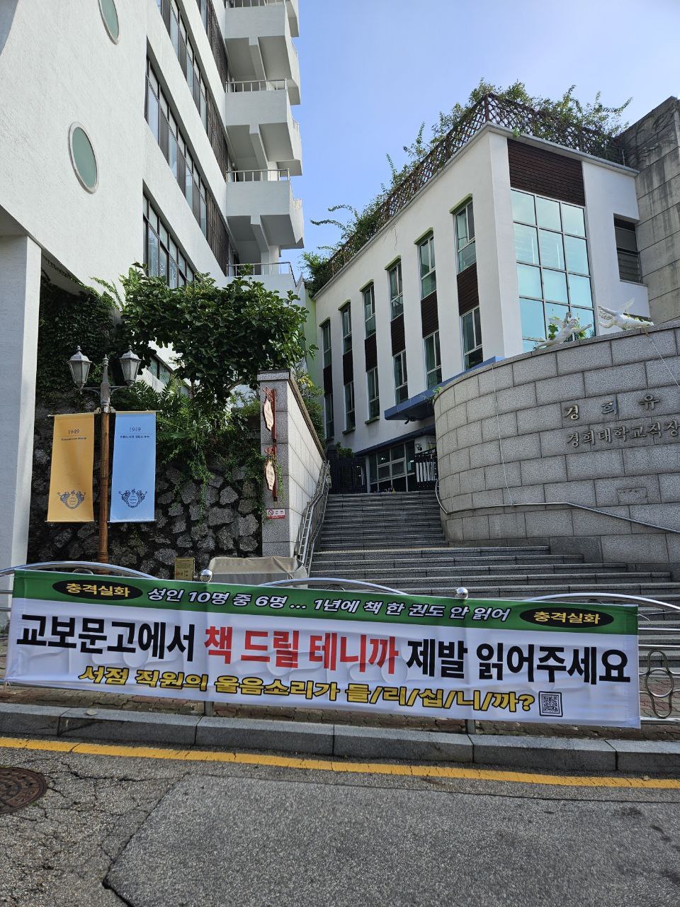일어나서 운동- 밥- 도서관 근무 똑같이. 아침을 먹고 나오는데 유치원 앞 현수막이 바뀌어 있었다. 간절한 호소를 익살스럽게 표현한 게 웃겼다. 책을 안 읽고 살 때는 "한국인 독서량 1년에 몇 권 어쩌고"할 때 내가 그런 사람인데 뭐 어쩌라고 했다. 지금은 소수파에 속해있다는 느낌이 썩 나쁘지 않다. 아니 떳떳하고 좋다.
