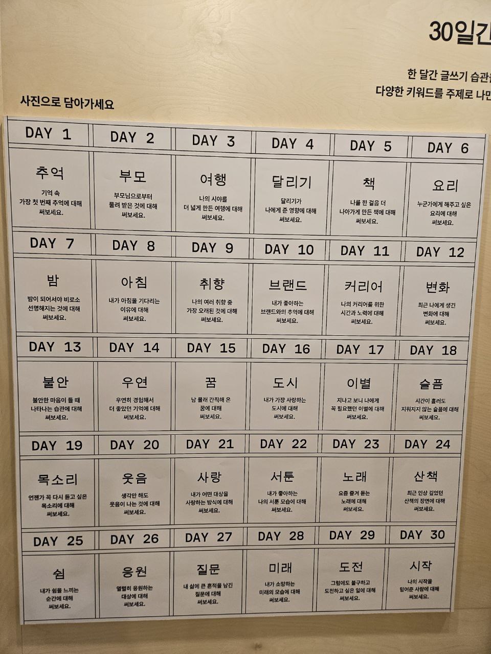 구경을 어느 정도 한 후 통로 쪽에서 가장 가까운 테이블에 앉아서 워크북을 작성했다. 질문들에 답을 해보면서 나에 대해서, 글쓰기에 대해서 생각해 볼 수 있었다. 잊고 싶은 뭔가가 있냐는 질문에는 갑자기 내 잘못으로 아주 어린 여동생에게 트라우마를 만들어버린 것이 생각났다. 나라고 말을 해야 하는데 용기가 없어 그 망설임을 해결하지 못하고 있다는 무거운 죄책감에 눈물이 날 것 같았다. 아니, 좀 났다.