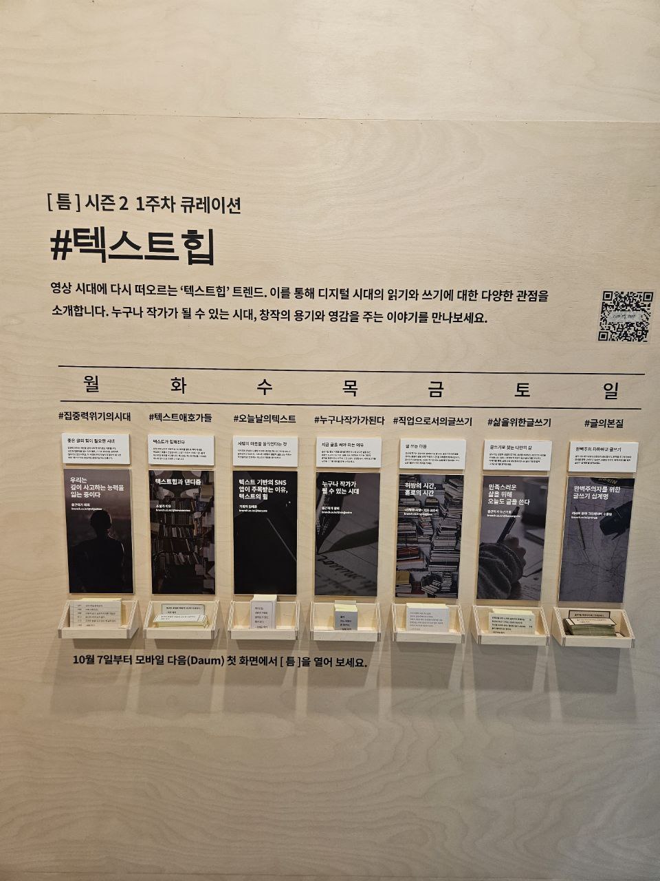 브런치 앱에 들어오면 광고가 뜨기도 하고, 카톡으로도 광고가 왔었기 때문에 팝업 전시가 있다는 건 알고 있었다. 딱히 가볼 생각을 하고 있던 건 아니었는데 한 청년이 같이 가시겠냐고 물어봐오니 생각을 해보게 됐다.