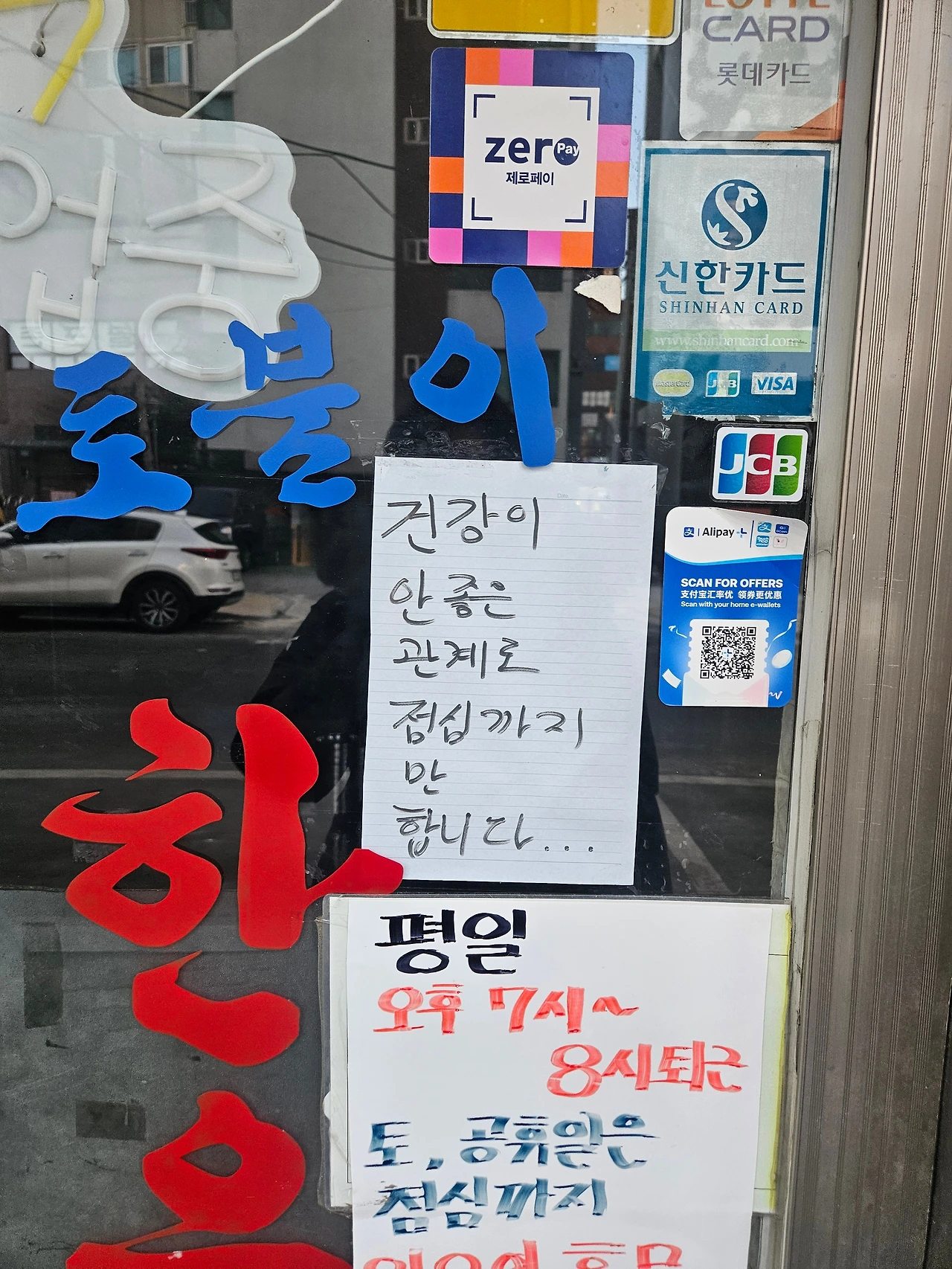집에 가다가 본 "건강 때문에 점심까지만 한다..."는 말 끝에 말줄임표가 왠지 구슬퍼 보였는데 다들 건강하시기 바랍니다.