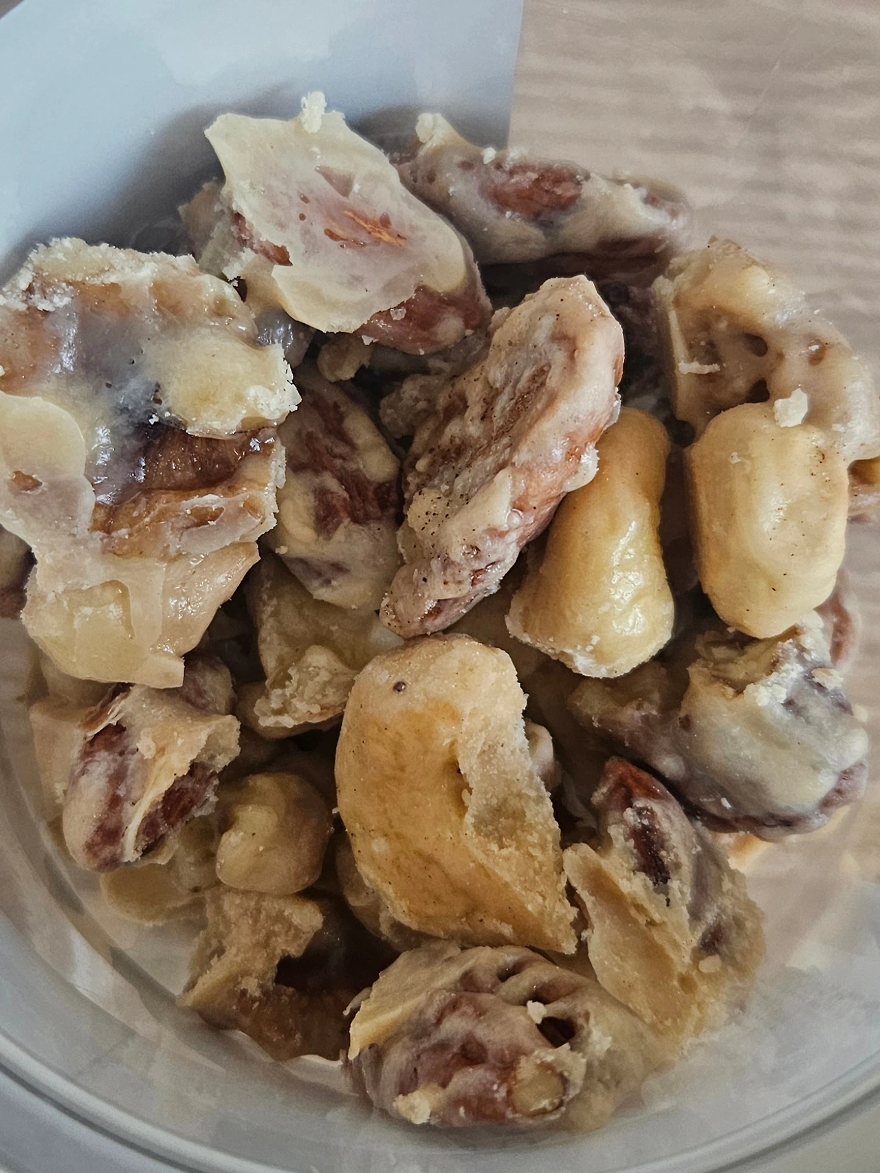 결과물을 냉동고에 넣어서 굳히는 동안 옷을 입고 선크림을 발랐다. 테이블을 행주로 깨끗하게 닦고 커튼을 양쪽으로 걷어서 묶어 놓고 화장실에 떨어진 머리카락을 치웠다. 시간을 적당히 보낸 것 같을 때 냉동고에서 견과류를 꺼내 톡톡 쳐서 낱알을 분리시켰다. 그리고 하나 먹어 보니 운 좋게 오늘 만든 것은 결과가 상당히 좋았다. 너무 달거나, 좀 덜 달거나 하지도 않았고 소금도 적당히 뿌려졌는지 짜지도 않았다.