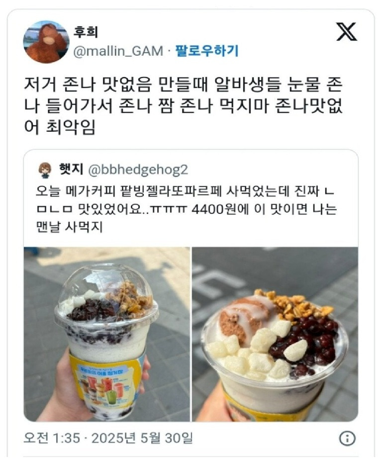 2주 전쯤 인터넷에서 '알바생의 눈물'이라는 키워드로 메가커피 팥빙젤라또파르페 바이럴을 처음 접했다.