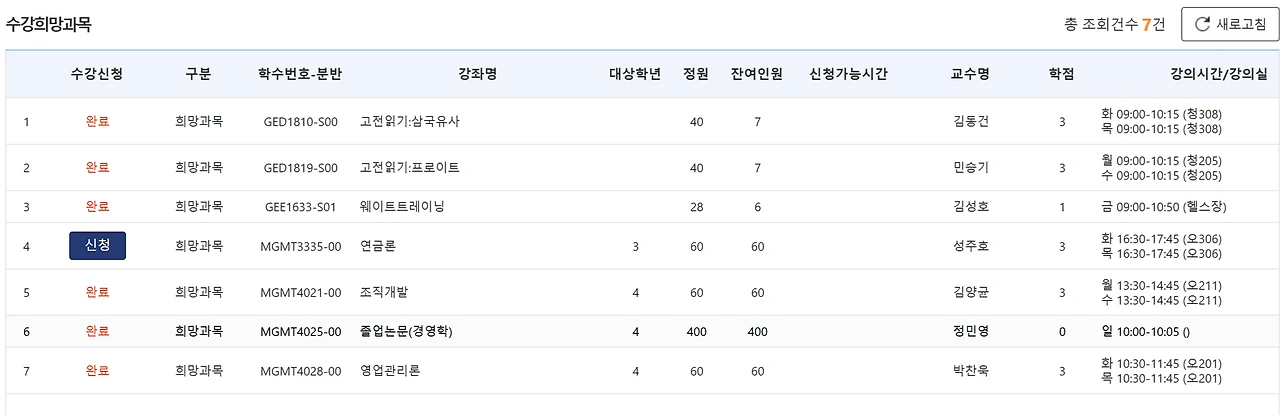 8월 5일 화요일 10시 30분부터 25-2학기 수강 신청이 열렸다. 4학년부터 순서대로 하루씩 열어줬다가 12일에는 전학년이 다시 신청을 할 수 있게 돼있다. 수강 신청 대기하던 중에 정원이 40명인 강의에 잔여인원이 7명으로 뜨길래 행정실에 전화를 해봤다. 4학년 쿼터가 7명이라는 답변을 들었다. 생각보다 좁은 관문에 갑자기 긴장이 됐다.