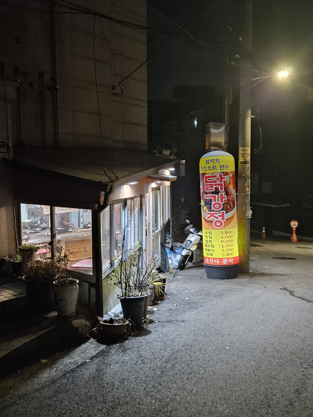 지난 학기 재입학을 하면서 외롭고 지친 내가 가끔 힐링을 위해 닭강정을 사 먹었던 곳이다. 기숙사에서 걸어서 3분 걸리는 위치라 접근성 때문에 처음 가게 됐다. 맛있었다. 네이버에 후기도 달았었다. 항상 라디오에서 올드팝이 나오고 사람도 적어서(거의 없다) 조용하고 편안한 분위기에 닭강정 자체도 맛이 괜찮다. 나이가 좀 있으신 사장님은 소란스럽지 않고 늘 왠지 모르게 무기력한 느낌으로 묵묵히 요리를 하신다. 그것도 좋다. 소스 첫 맛에서 시큼한 맛(케찹인지, 고추장 소스에 섞인 식초인지)이 나는 부분이 그나마 좀 신경 쓰이는 부분이다. 영월에서의 두 닭강정을 먹고 온 이후 오랜만에 여기 닭강정을 먹고 명확한 비교를 해보고 싶었는데 그러면 너무 양심 없이 자주 먹는 것 같아서 며칠 참다가 오늘 오랜만에 다시 가서 먹어봤다. 맛있었다. 튀김 고유의 좀 먹다 보면 느끼해지는 맛이 덜 든다.