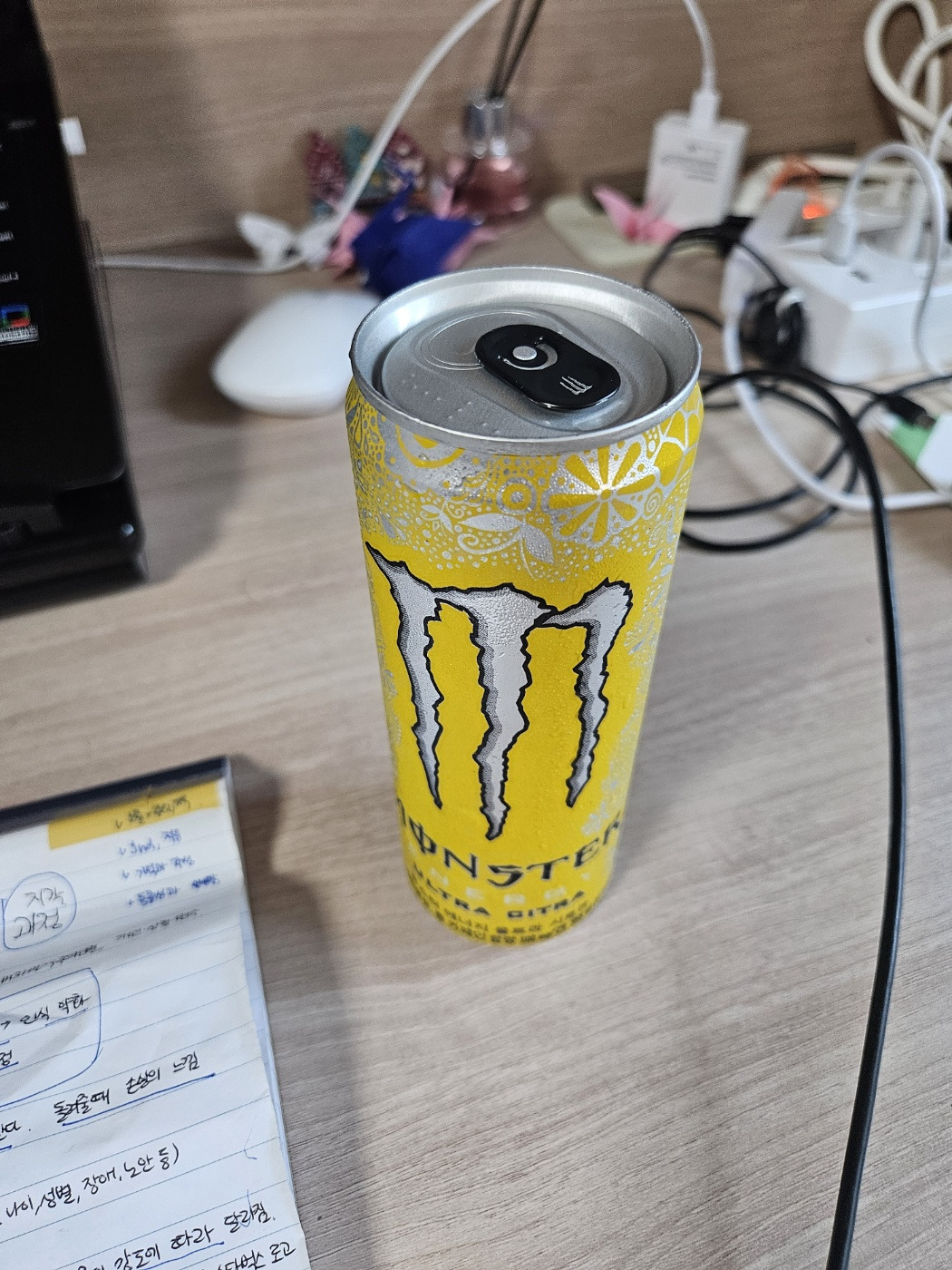 그리고 금요일에 있을 시험을 위해 다시 공부를 시작했다. 이번 기말고사 기간에 생전 처음으로 에너지드링크를 마시면서 공부를 해봤다. 그래봤자 세 캔 마셔 본 게 다지만. 나도 그런 걸 해보고 싶기도 했고 공부시간 압박 때문에 새벽에 깼더니 오후에 졸려서 공부를 할 수가 없어서 한 번 먹어봤다. 솔직히 분다버그 레몬맛 먹고 싶은데 비싸니까 몬스터 시트라 골랐던 것도 있다. 어쨌든 효과는 분명하게 느껴졌고 도움도 분명 됐지만 한편으로는 피곤한 몸과 정신이 억지로 깨워져 있는 것이 느껴져 무섭기도 했다.