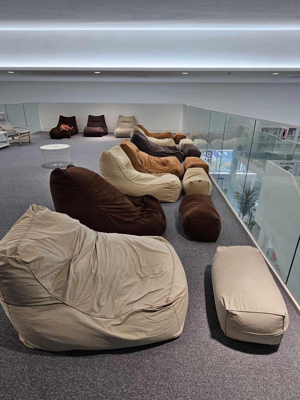 문을 열고 들어서자 "헤엑" 소리가 말 그대로 절로 나왔다. 너무 깔끔하고 넓었다. 가까운 곳에 이런 데가 있으면 정말 좋겠다는 생각을 할 동안 청년은 바로 멘토링을 시작하기 위해 2층으로 올라갔다. 청년이 멘토링을 할 동안 나는 내부 구경을 한 후 마음에 드는 칸을 골라 빈백에서 책을 읽었다. 이 시간을 위해 굳이 챙겨 온 책이었지만 읽다가 많이 졸았다. 가장 안전한 수면제는 책이 아닐까? >,.< 데헷