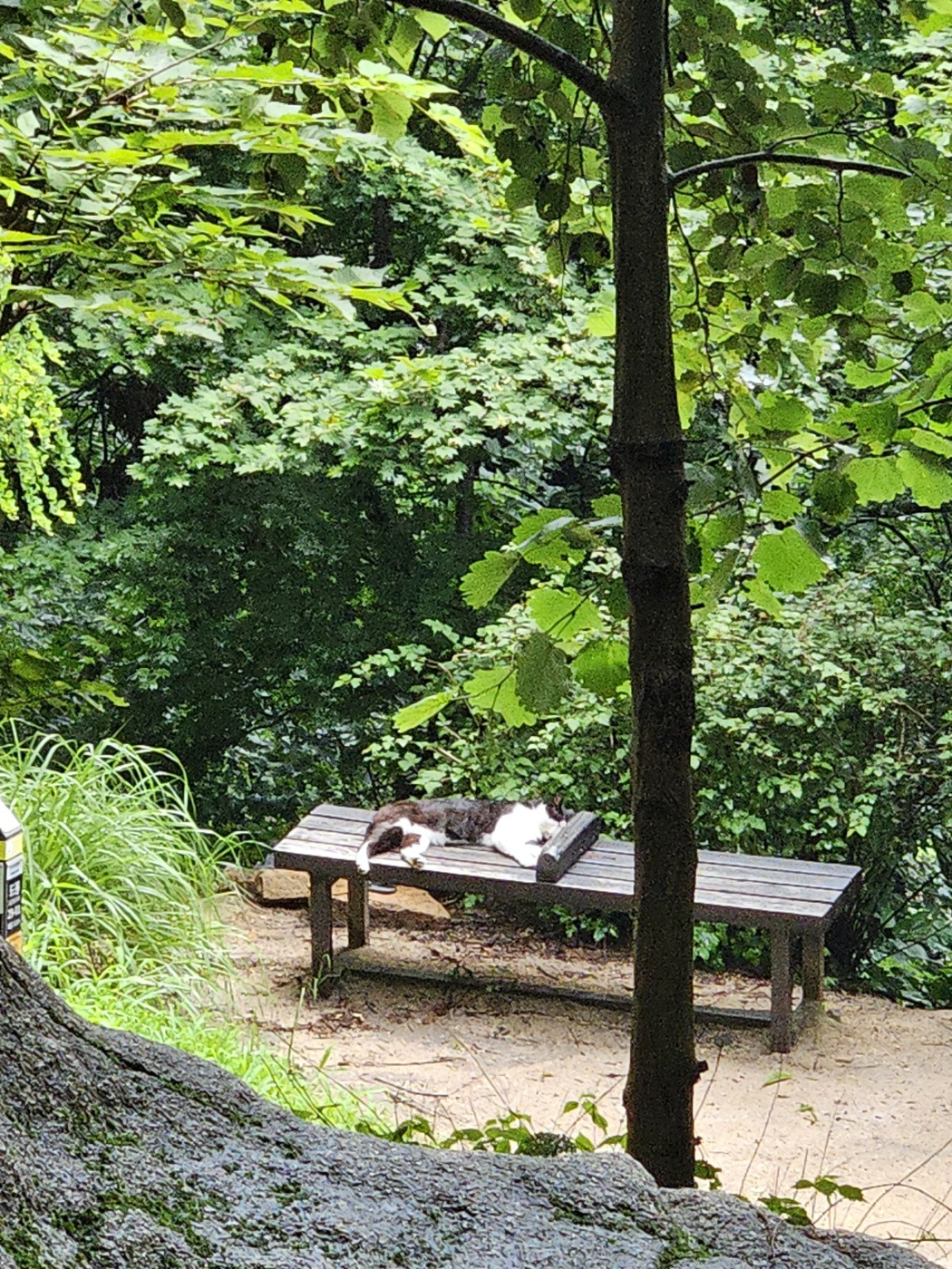 벤치에 고양이가 사람처럼 누워 자고 있어서 놀라기도 했다.