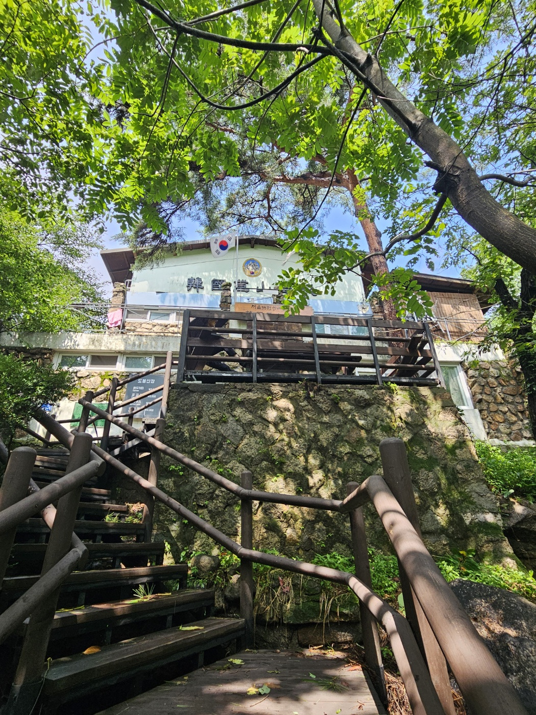 올라갈 때는 비 때문에 서두르느라 지나쳤던 산장도 내려올 때 들러서 구경했다. 청년들이랑 도봉산을 같이 오게 된다면 정상은 힘들 것 같고, 산장까지만 왔다가도 좋겠다고 생각했다. 산장 야외 테이블 옆으로 계곡이 내려가고 있어서 느낌 있다.
