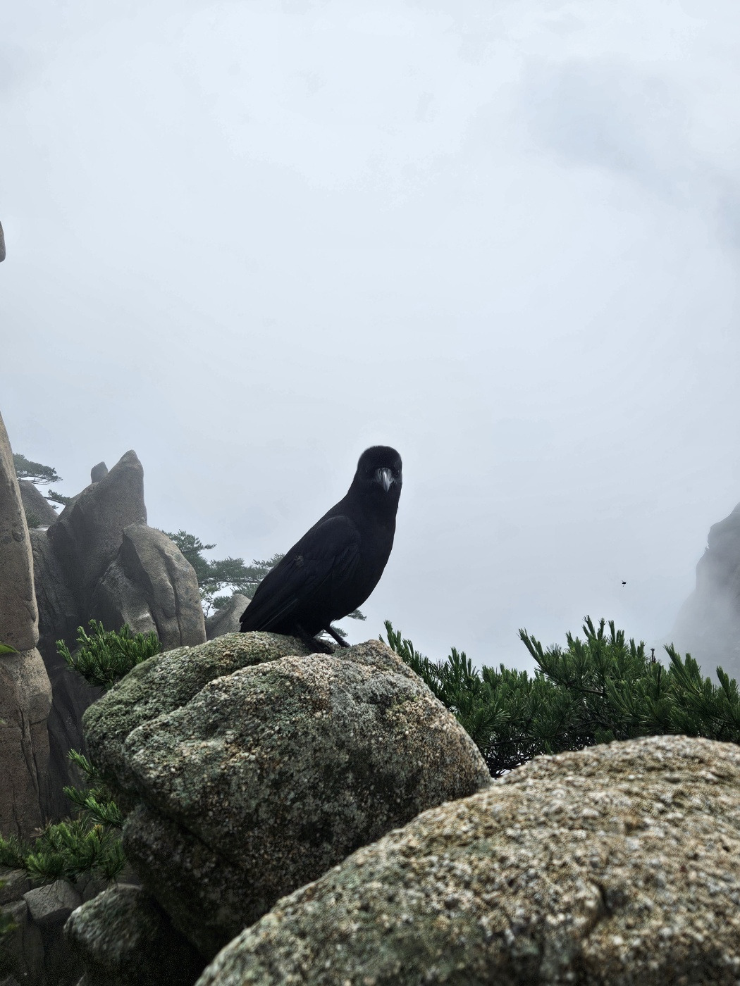 자운봉이 해발 740m고 신선대는 조금 낮은 726m였다. 정상에서 이번에도 단백질바와 물을 마시면서 쉬고 있는데 까악 거리는 소리가 처음 들어보는 볼륨으로 들리길래 뒤돌아봤더니 바로 옆에 까마귀가 앉아있었다.