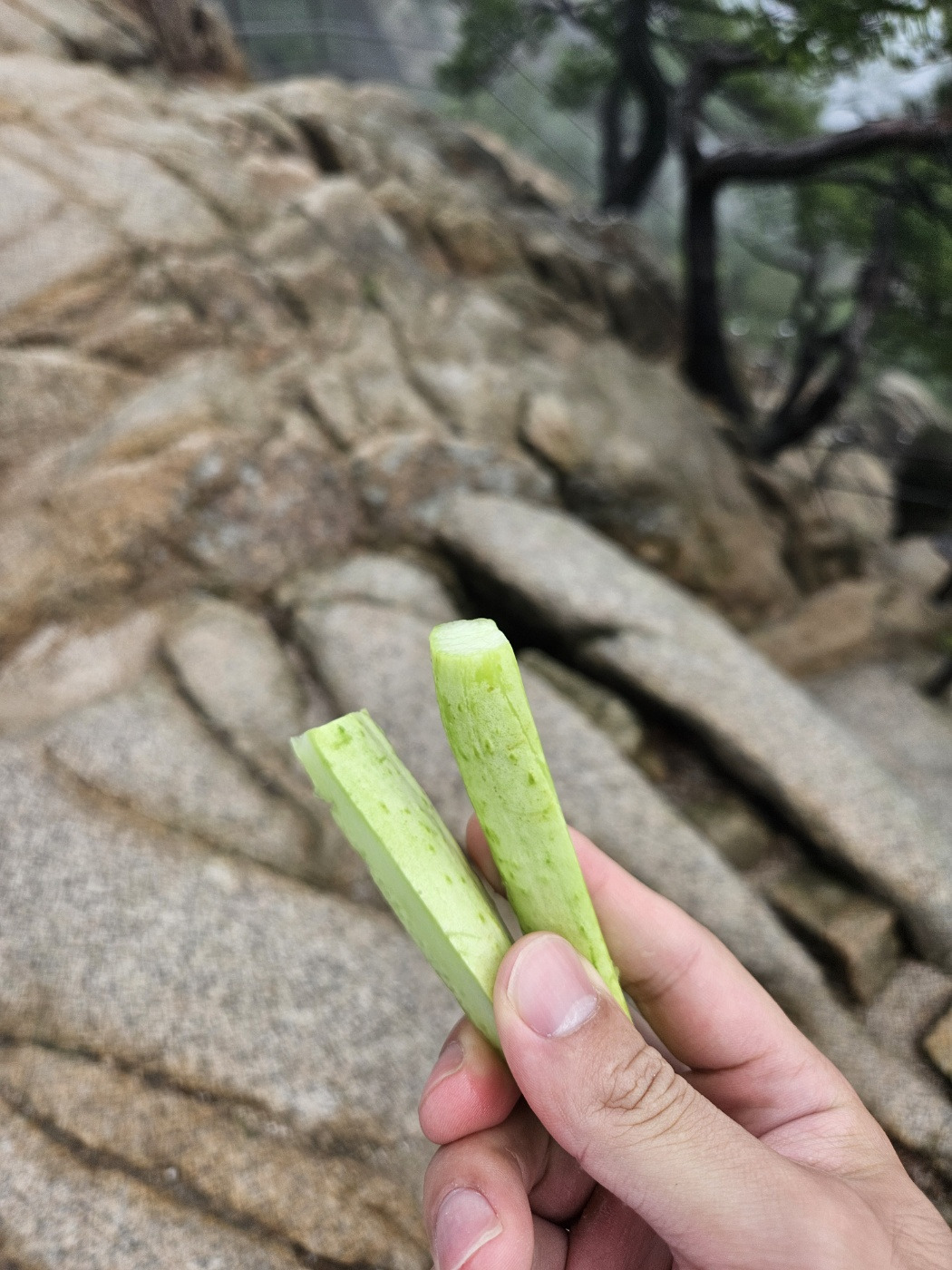 옆에 새로 올라오신 지긋한 형님분들에게 "조심히 가세요~." 하고 인사드리고 내려가려는데 오이를 주셨다.