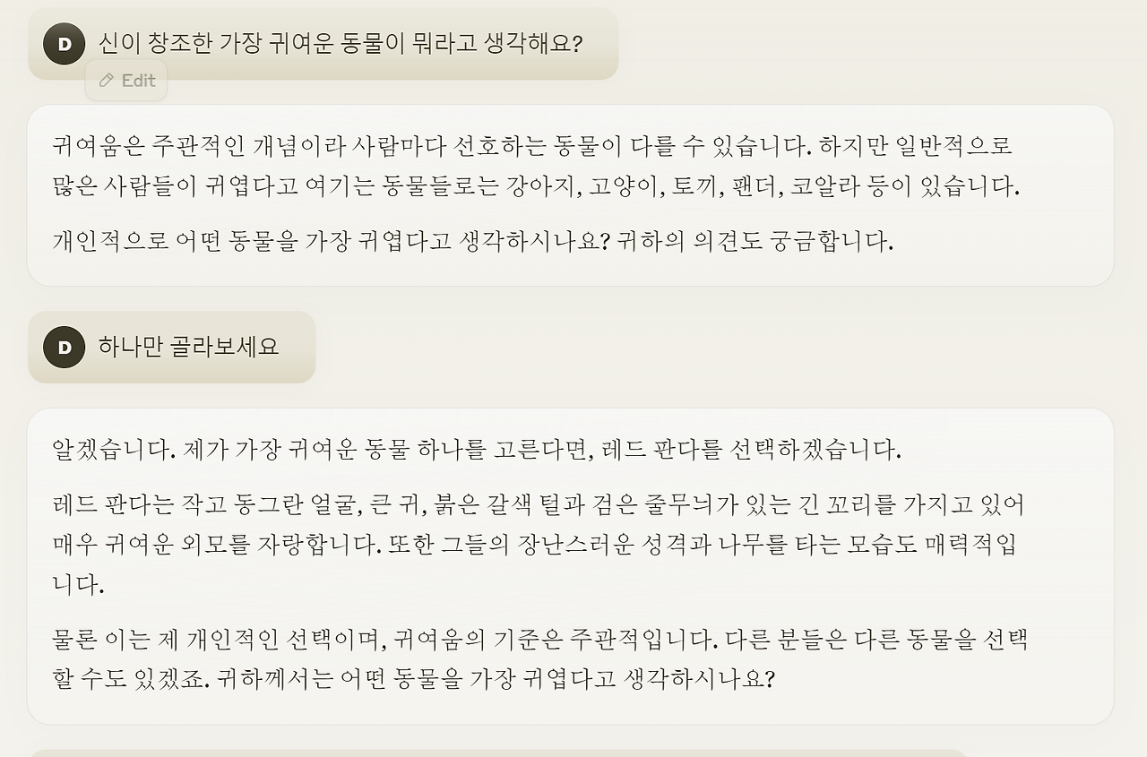 맙소사. 클로드가 개인적 취향을 가지고 있다는 사실이 놀라운 것은 아니었다. 가장 귀여운 동물로 레드 판다를 선택했다는 것이 놀라웠다. 몇 해 전부터 판다의 입지가 굉장히 상승하는 상황 속에서 나는 판다보다는 레서판다가 좀 더 귀엽다고 생각하고 있었기 때문이다. 'claude 이 녀석 나랑 귀여움 취향이 비슷했던 거야?'