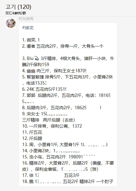 단체 대화방에서 주문할 때는 누군가 먼저 주문 목록을 만들어 대화로 올리고, 다음 사람들이 일련번호와 함께 본인 주문을 붙여가며 대화로 올린다. 기존 주문 전체를 복사해 그 뒤에 나의 주문을 덧붙여 다시 대화방에 올리는 방식이다. 나는 어젯밤에 13번으로 주문했다. 수량을 기입하지 않아 가게 주인이 얼마나 원하는지 대화방에서 묻기도 했다. 나는 총 두 근(1kg)이라고 답했고 주인은 알겠다고 했다.