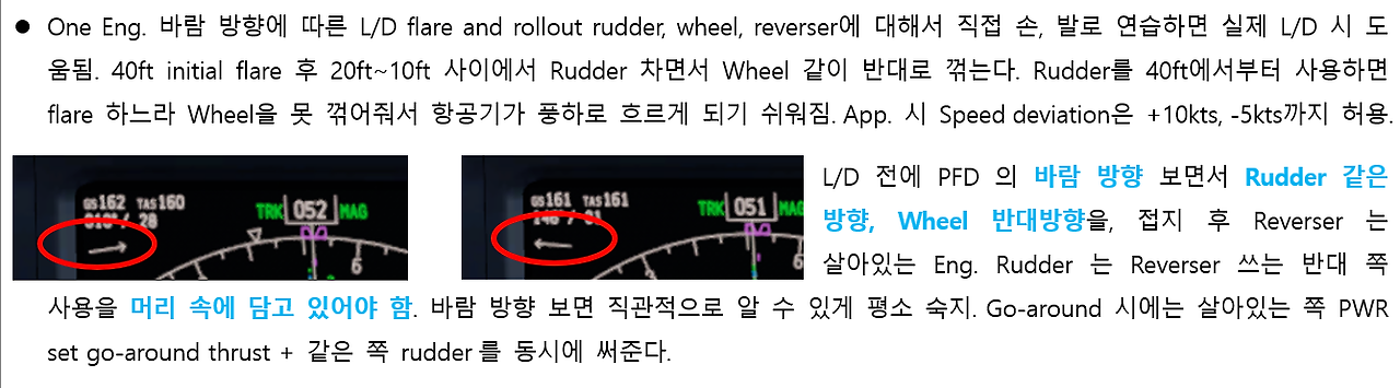 랜딩은 정면보다 옆에서 바람이 심하게 불 때 더 어렵다. 시뮬레이션에서 하는 어려운 과목 중 하나는 최대 옆바람(측풍, 測風)이 부는 상황에서, 엔진 하나를 끈 채, 공항 접근 시설 도움 없이 시각으로 높낮이를 측정하며 내려야 하는 것이다(Max cross wind single engine raw data). 까다로운 만큼 체크 때 항상 하기 때문에 특히 이 상황을 이미지 트레이닝으로 연습했다.