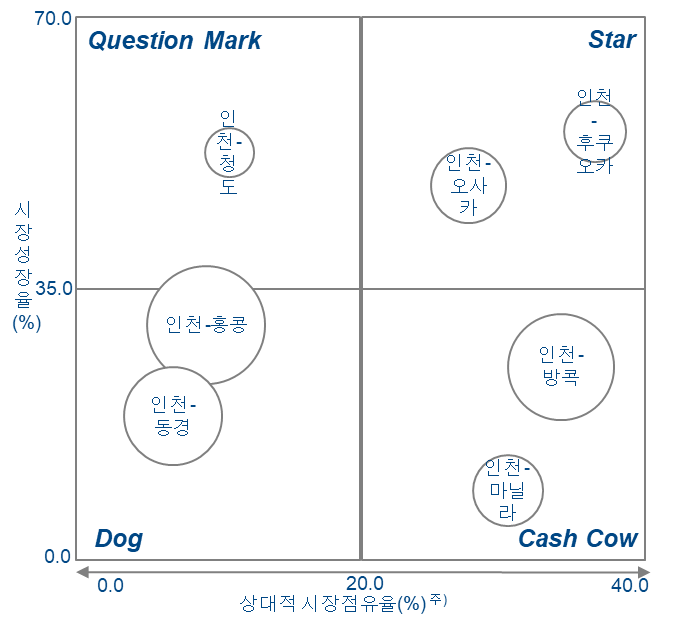 '인천-후쿠오카', '인천-오사카' 노선은 시장 성장률이 높은데 상대적 시장점유율도 함께 높기 때문에 현재 저비용항공사의 스타(Star) 상품이라는 것이 핵심이다.