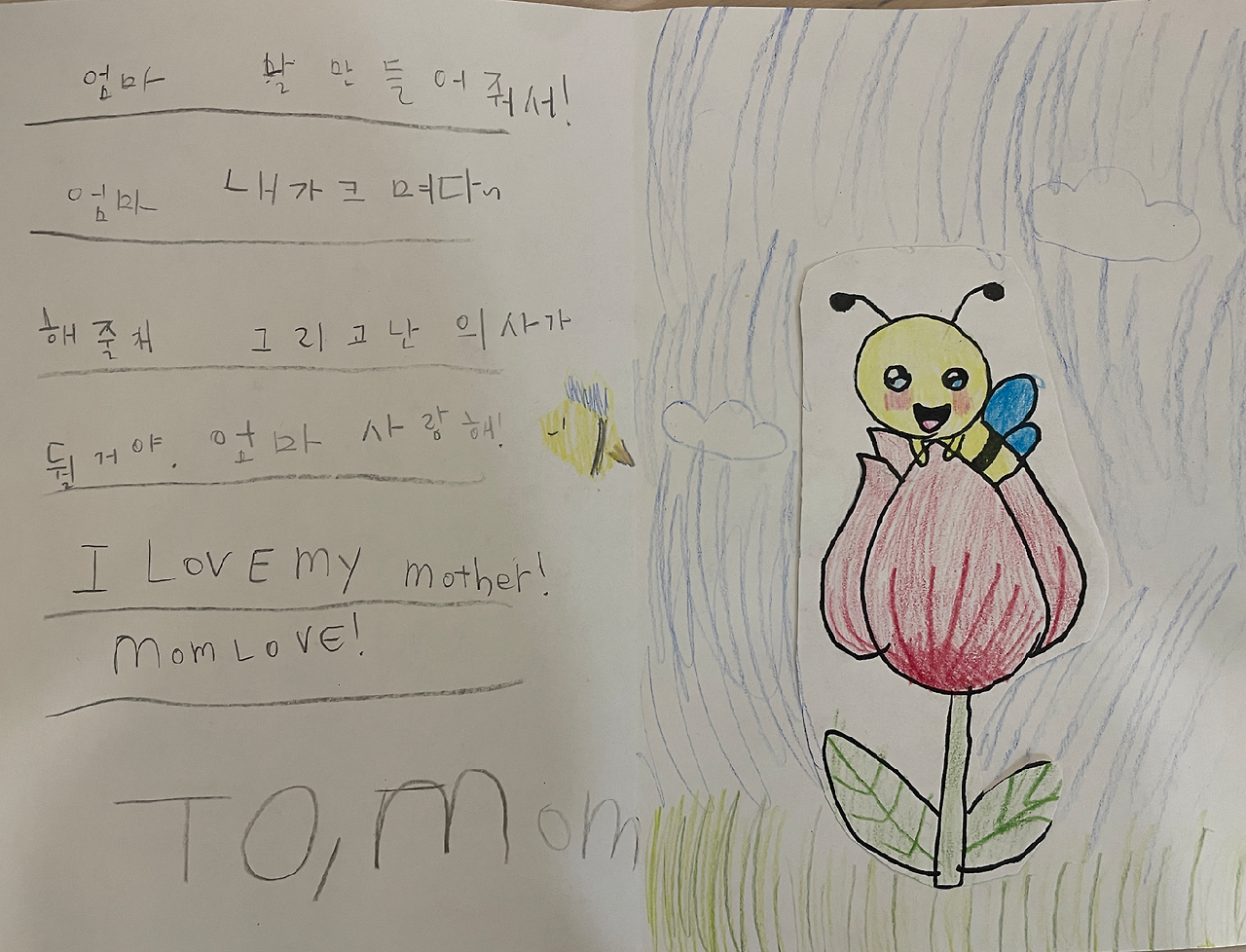 얼마 전, 아이가 학교에서 만든 마더스데이 카드를 건넸어요.