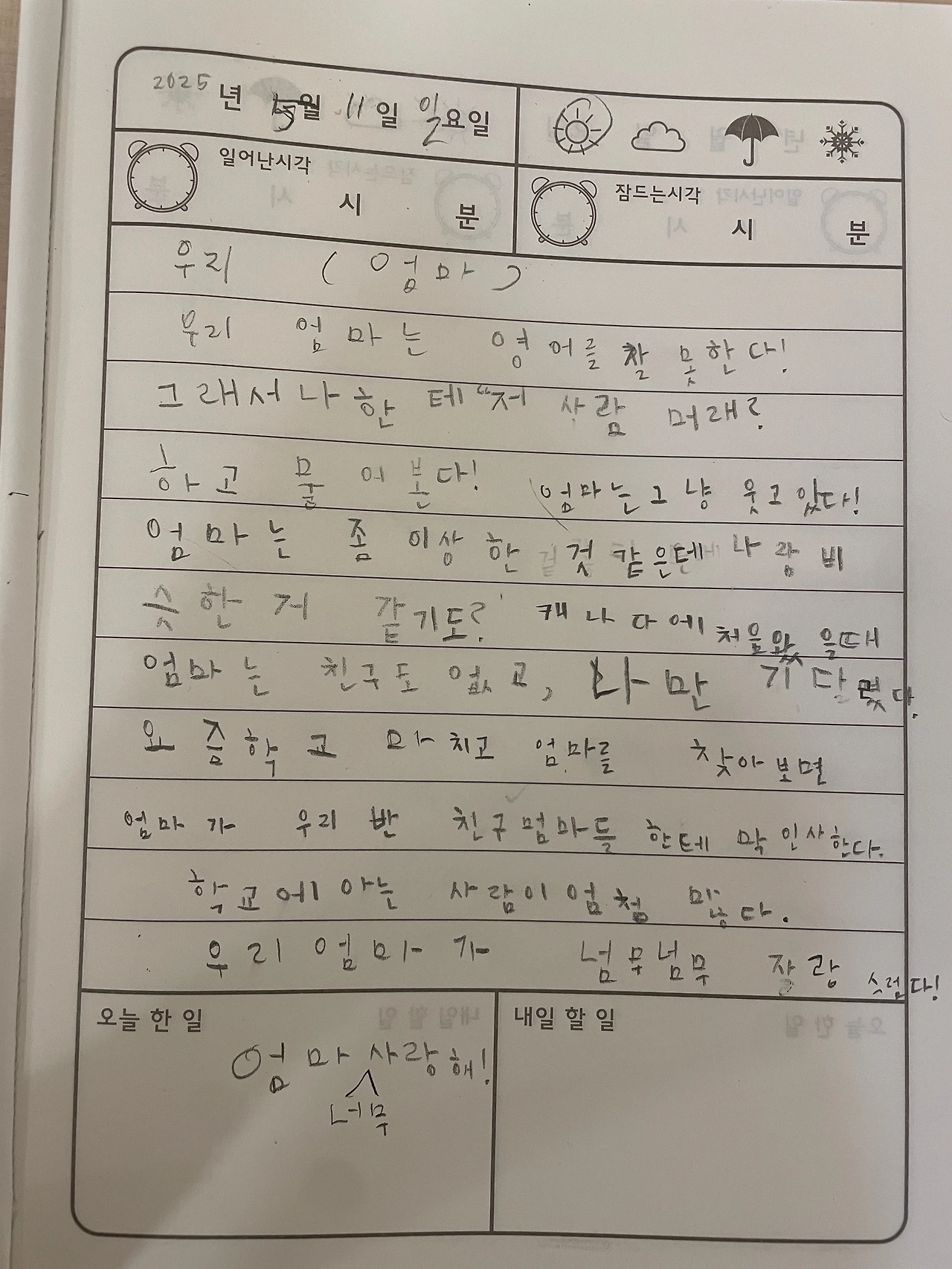 아이의 그날 일기장이 인상적이어서 아이의 허락을 받고 올려봅니다.