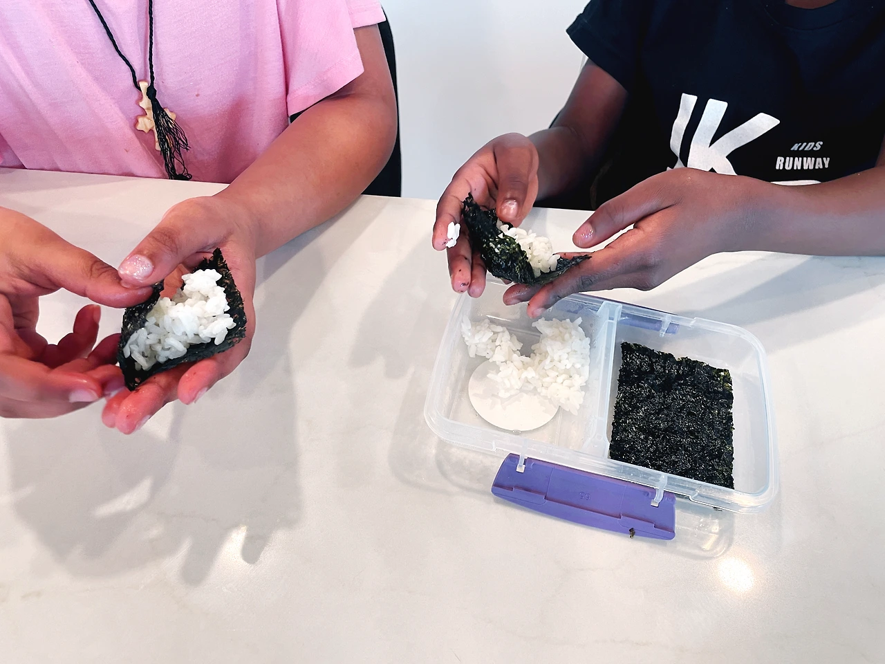 친구들이 김 위에 밥을 올려 싸 먹는 것을 따라 하고 있습니다. 작전 성공입니다!!!