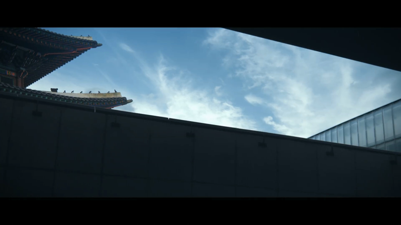 서울이라는 도시가 지닌 '문화재와 현대 건축물의 어우러짐'이라는 특이점을 시사하며 시작하는 탁월한 첫장면이라고 생각한다. 뒤이어 나오는 대부분의 시퀀스가 비슷한 양상을 보여주겠음을 암시하기도 하고, 특히나 어두운 벽면과 맑은 하늘을 대조적으로 배치하여 처마에 시선을 집중시키게끔 만든 점도 대단하다.