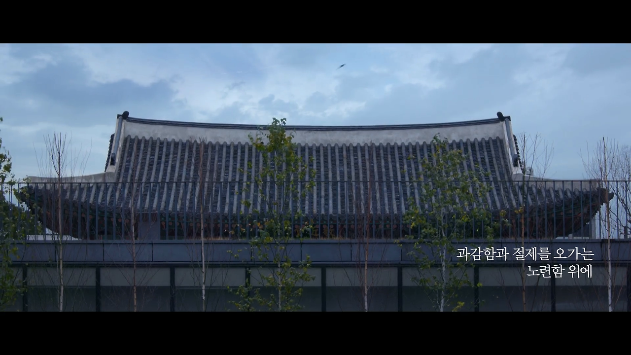 어디 궁일까? 지미집 장비로 서서히 올라가며 보여주는데 단순히 넓은 궁의 외부 전경뿐만 아니라, '노련함 위에'라는 카피를 강조시켜주는 수직의 시선을 보여주는 듯하여 좋다. 특히나 이 컷 이전에는 돌벽 앞에 서있는 개성 넘치는 의상의 모델을 보여줘 말그대로 과감함과 절제를 표현하고 직후 궁궐을 보여주며 노련함을 강조하는 부분도 센스있다.