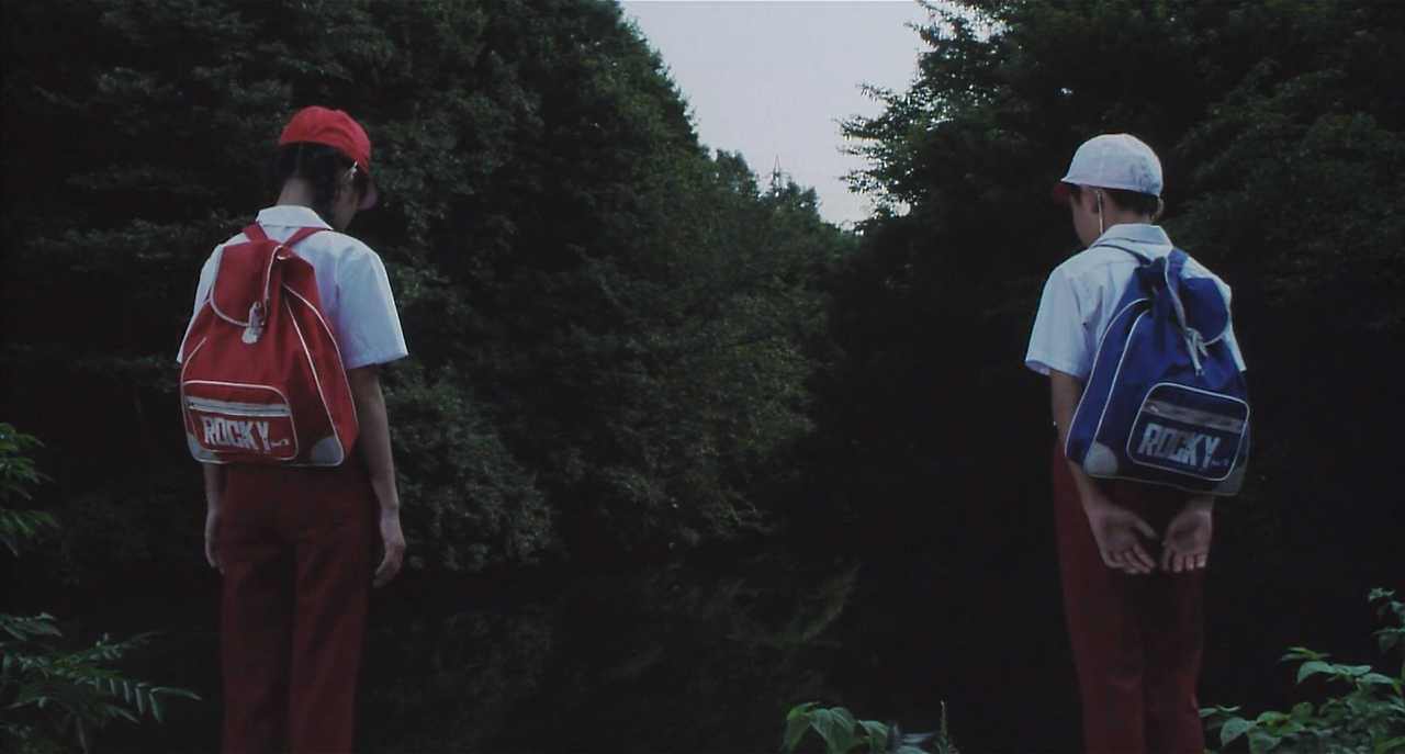 빨간 모자 가방과 파란 가방의 대비, 양쪽 인물 뒤에서 큰 광원을 비춰 배경과 대비를 줬을듯.
