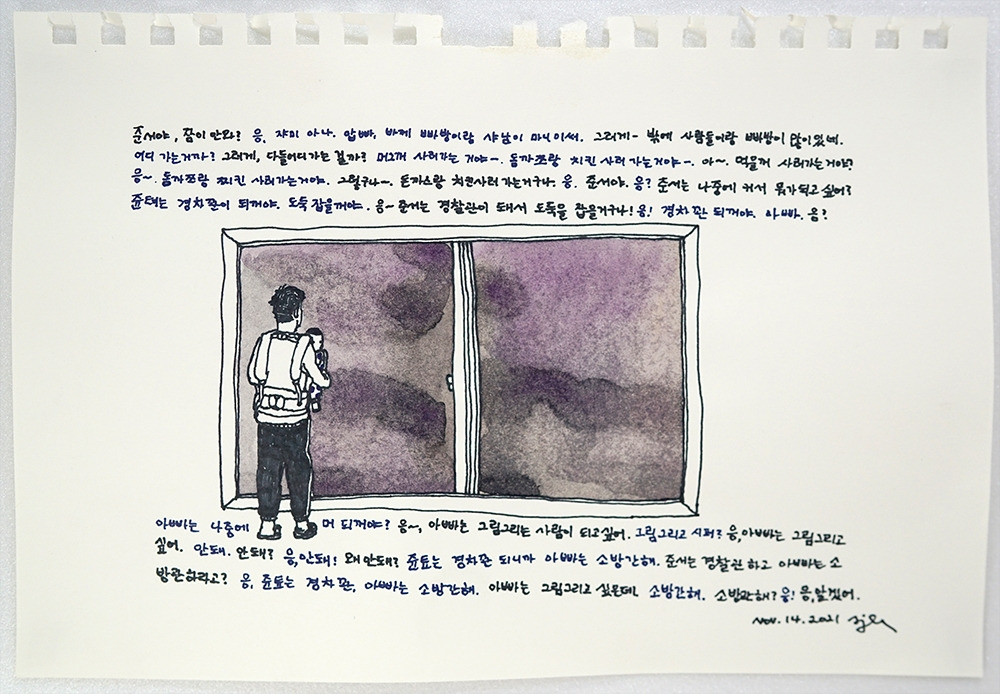 콩돌이에게 저는 '미술가' 아빠로 보이고 싶었습니다. 매일 집에서 설거지와 청소를 하는 정체불명의 유학파 주부가 아니라 정제된 공간에서 품위를 갖춘 그림들을 소개하는 사람으로 기억되기를 바랐습니다. 눈물깨나 쏟은 후에 기적처럼 얻게 된 개인전에서 아들은 아빠에게 "It's amazing!"이라는 탄성을 힘껏 치켜든 조그만 엄지손가락과 함께 연발했고, 저는 콩돌이가 가르치지도 않은 영어를 어디서 배워왔는지 어리둥절해하면서도 너무 다행이라고 생각했습니다.