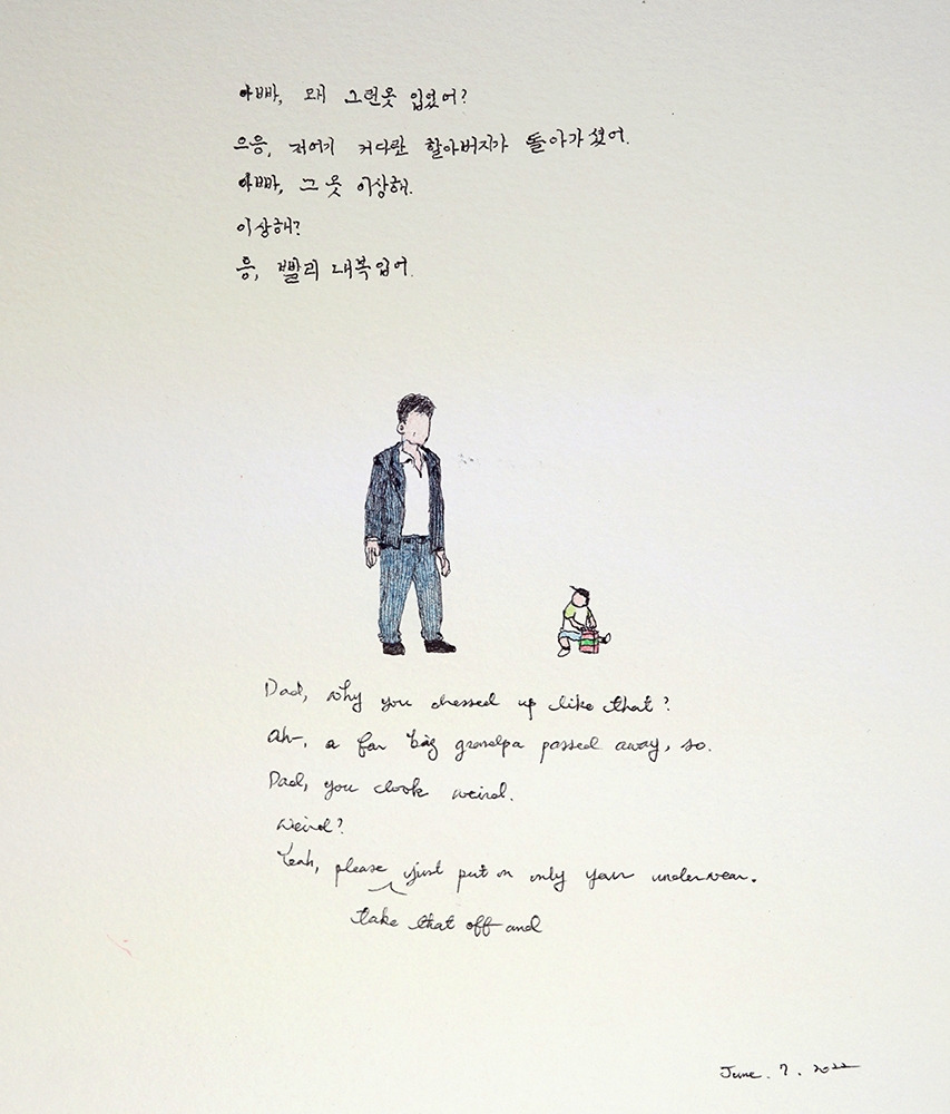 콩돌이는 항상 목이 잔뜩 늘어난 반팔티셔츠에 할머니가 가져다준 냉장고 바지만 입던 아빠가 위아래로 어두컴컴한 옷에 끼어있는 모습을 보고 적잖이 어색했나 봅니다. 자신도 늘 내복차림에 아빠도 편한 옷으로 바닥을 뒹굴며 놀았으니 빨리 익숙한 모습으로 돌아오라고 재촉하였습니다. 내심 아들의 칭찬을 기대하던 저는 생각지도 못한 말에 웃음을 터뜨렸습니다. 그리고 장례식장에 모셔진 고모부께 마지막 인사를 올리고 이래저래 시커먼 옷으로 갖춰 입은 사람들을 만나 인사드리고 어색한 대화를 이어나갔습니다.