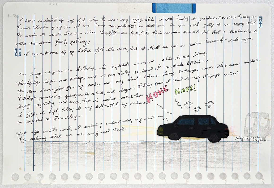저는 작업실에서 그랬듯이 빠르게 '괜히 쓴 글'은 없는지 스캐닝 했습니다. 만약 제가 아랍어를 할 수 있었다면 구불구불한 아랍어로 아무도 알아보지 못하게 썼을 글들 중 아버지가 경적을 울려대며 신경질을 내던 글이 흘려 쓴 영어로 적혀있었습니다. 아버지는 깨알 같은 한글을 천천히 훑어 내려가셨고, 자동차 위에 두툼하게 얹혀있는 영어 글씨에는 큰 관심을 두지 않고 경사로를 걸어 내려갔습니다.